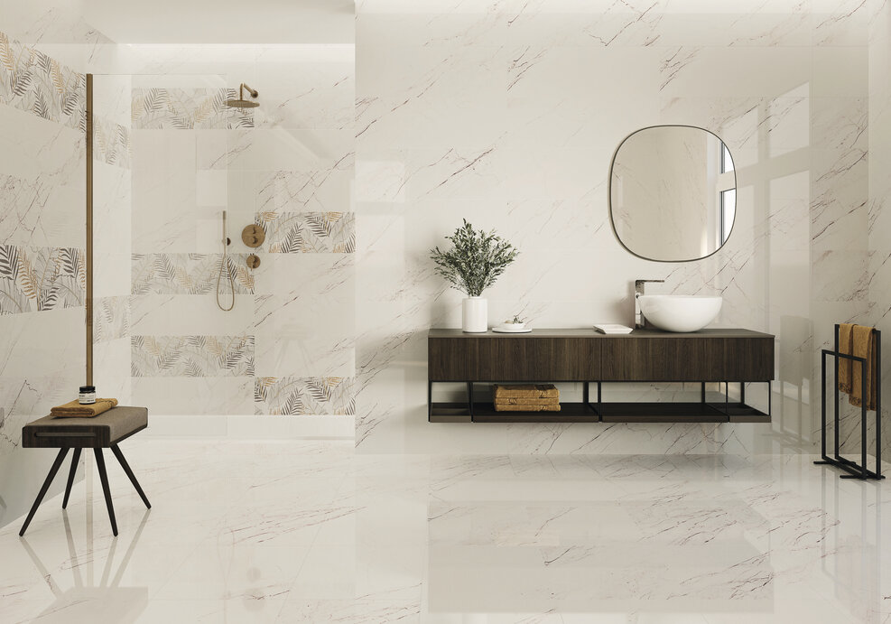 Мрамор съчетан с красива рисунка и текстура на декора. Природни елементи, внасящи една различна и ненатрапчива свежест в серии „Amposta“ от EL MOLINO