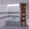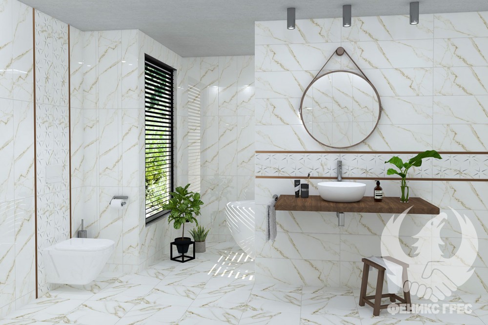 Нежни златисти шарки, наподобяващи жилките на естествен камък, правят интериора забележителен и луксозен. Добавете релефни плочки със същия десен за нотка свежест и ефектът ще е зашеметителен!