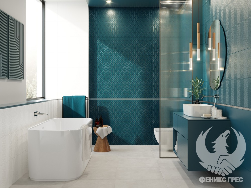 Представяме ви една изключително вълнуваща серия плочки за баня Blue Mat 30×60 – серия, която носи усещане за свобода. Наситен тюркоаз, геометричен мотив и нотка злато в декора създават елегантен и изискан интериор!