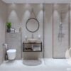 Шахматно подредените елементи разчупват семплата визия на банята. Интериорът е модерен, но се усеща сладкото очарование на едва доловима класическа нотка!