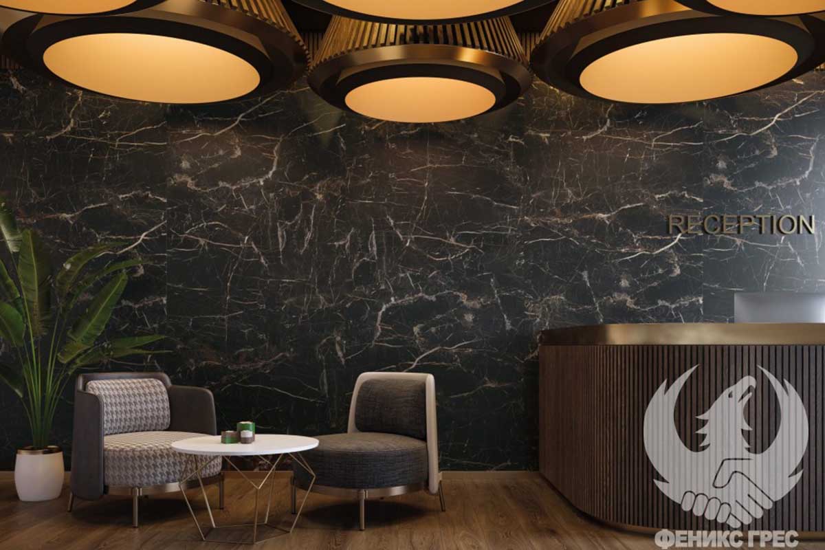 Различният размер на плочите и златистите нишки, имитиращи естествен камък, създават усещане за мащабност и лукс. Матиран гранитогрес MARQUINA GOLD ще ви помогне да постигнете впечатляващи резултати!
