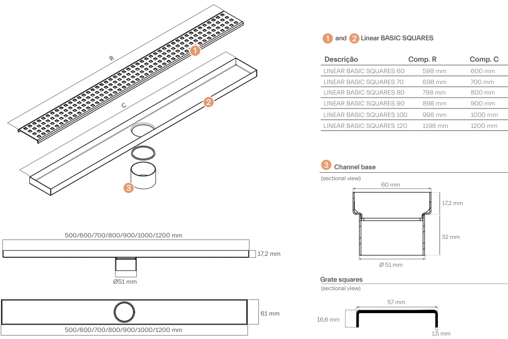 - Комплект с линейна решетка и сифон с ширина 61 мм