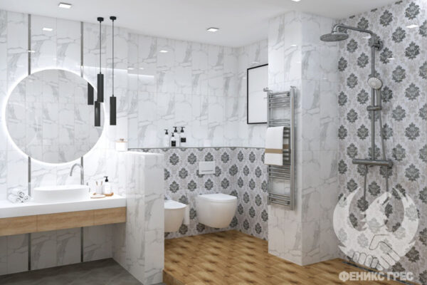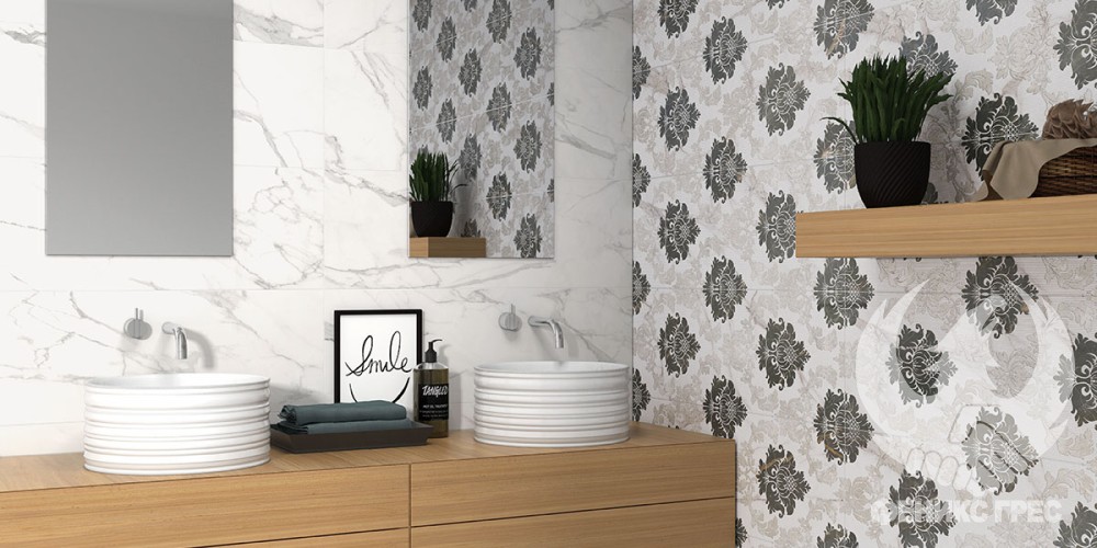 Разкошните елементи на декор RITUAL TAPET придават аристократично звучене на банята, а неутралните сиви нюанси внасят въздушност. Резултатът е стилна модерна баня!