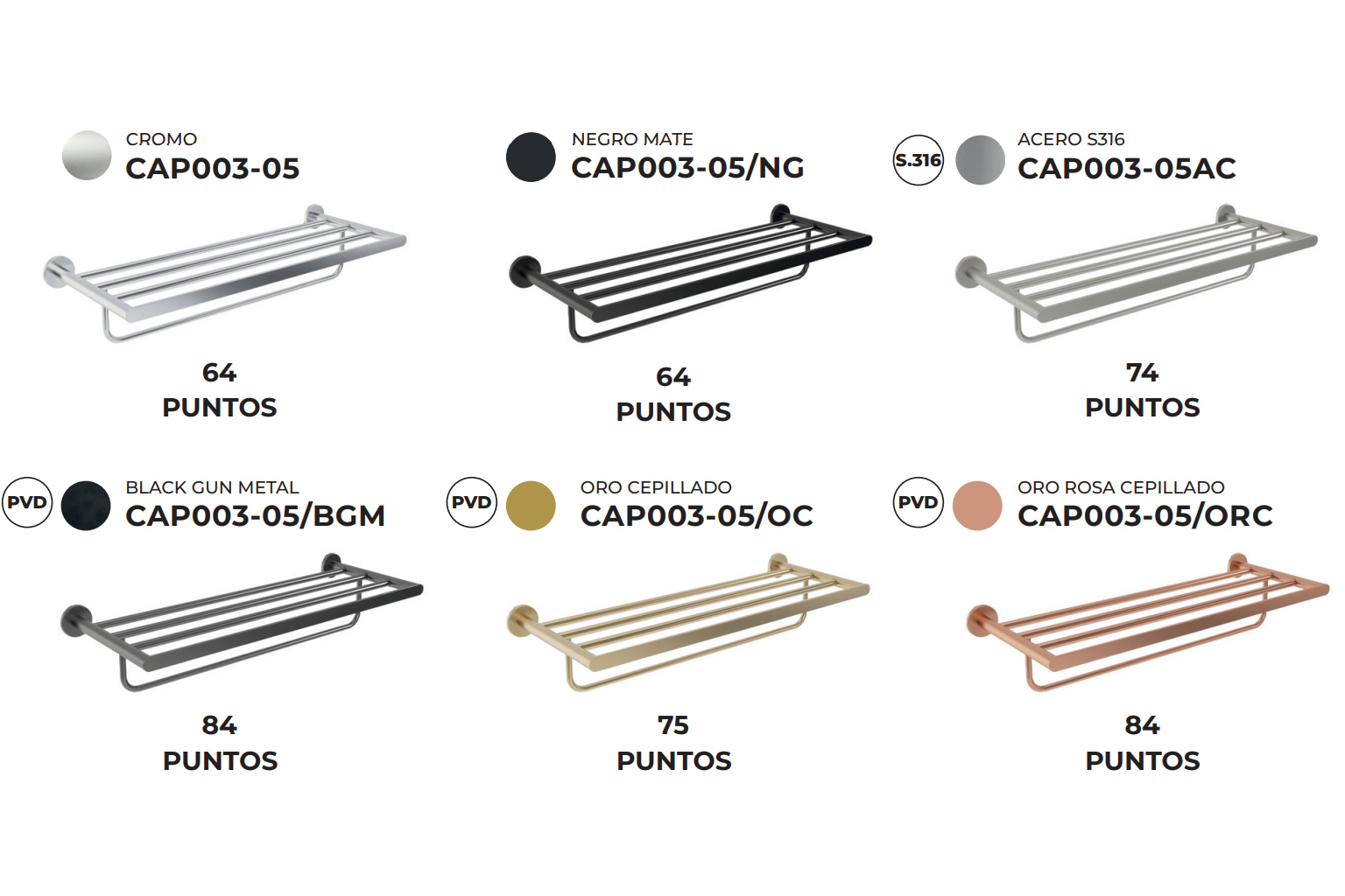Рафт за кърпи серия Practic от неръждаема стомана S.304 в 5 покрития и от неръждаема стомана S.316 (специална устойчивост на корозия) за цвят Acero.