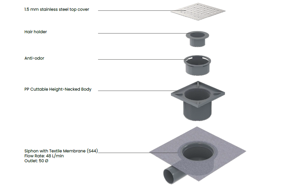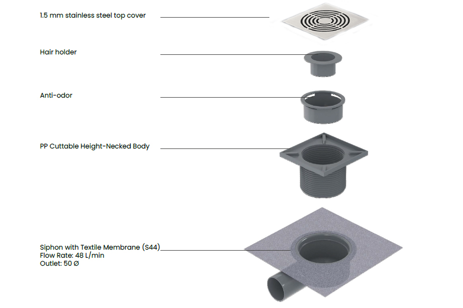 Smart Fllor Drain е подов сифон изработен от неръждаема стомана клас 304, което осигурява дълготрайна употреба и издръжливост. Освен това, основното тяло, изработено от полипропиленов материал, може да се реже, което позволява лесен монтаж и персонализиране според вашите нужди.