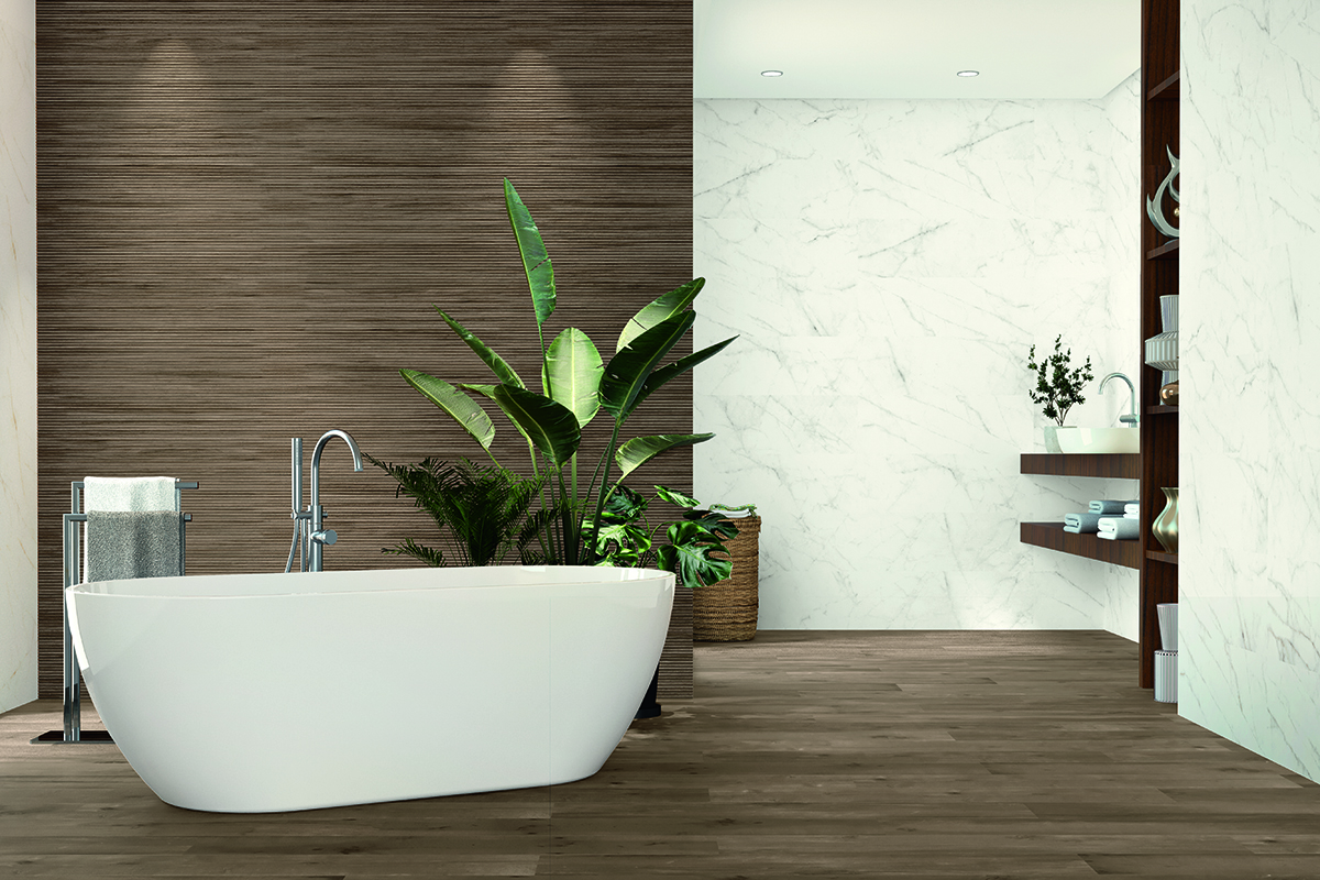 Една романтична спа целувка между мрамор и дърво.