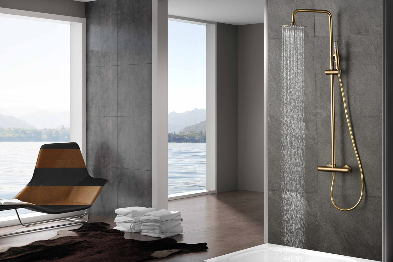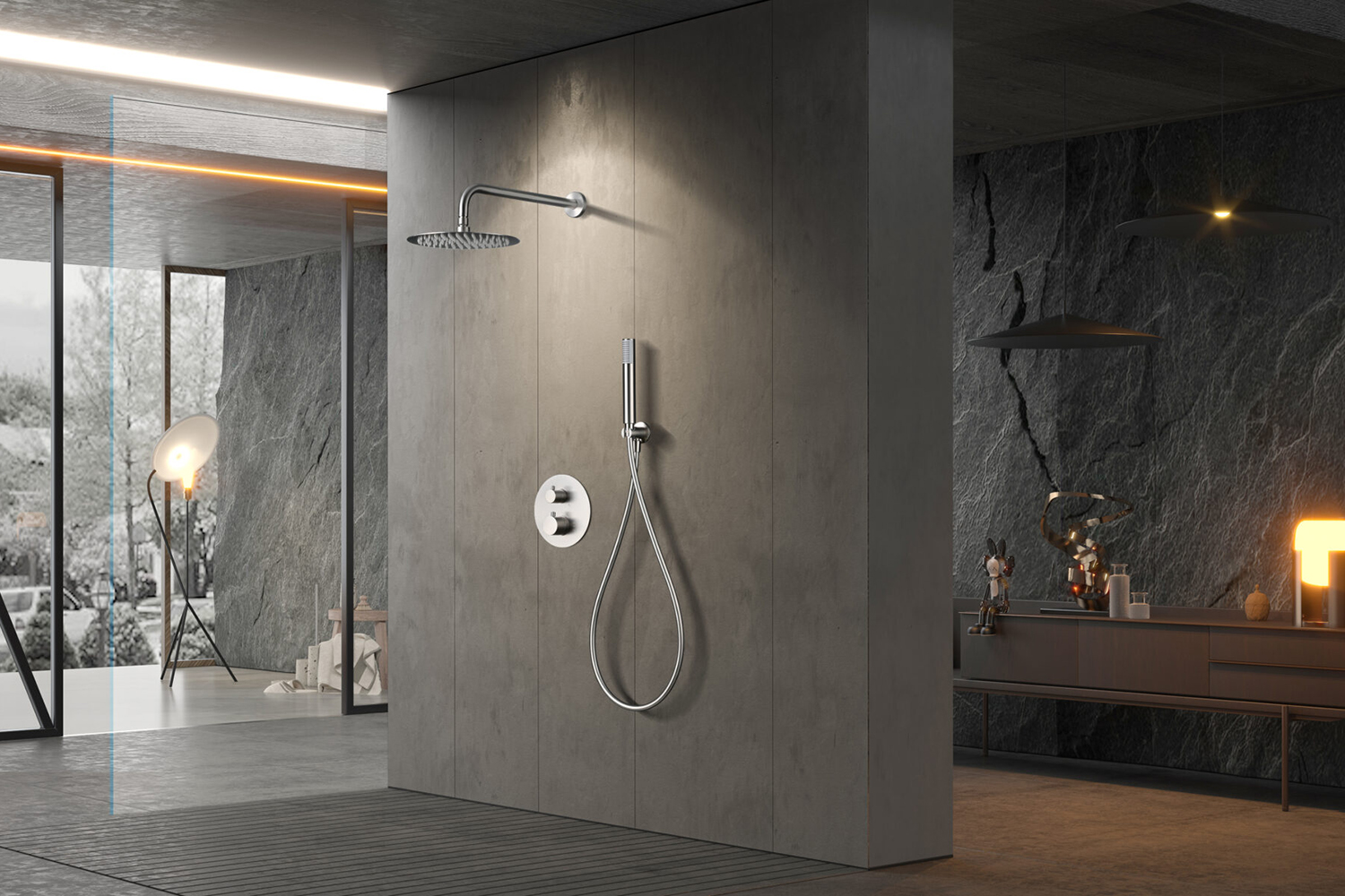 Подът в зоната около душа може да бъде решен с гранитогрес или гранитогрес 2 см, които се отличават с устойчивост и дълъг живот. За акцентна стена зад термостата може да се използват облицовъчни камъни, които придават текстура и стил.
